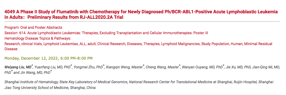 The 64th ASH (American Society of Hematology) Annual Meeting and Exposition is scheduled to take place in New Orleans, USA from December 10 to 13, 2022. The latest clinical trial results of Hansoh Xinfu (Flumatinib Mesylate Tablets), an innovative drug of Hansoh Pharma, will be presented in a Poster, oral form, representing a high degree of recognition by international authoritative experts of the efficacy and safety of flumatinib, a second-generation TKI developed independently in China, in primary ph+ALL.