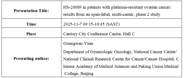 Hansoh Pharmaceutical Group Co., Ltd. (Hansoh Pharma, 03692.HK) today announced that positive Phase 2 results of HS-20089 (licensed to GSK as GSK5733584), a B7-H4-targeted antibody-drug conjugate (ADC), in platinum-resistant ovarian cancer (PROC) were presented as an  oral presentation at the 2025 International Gynecologic Cancer Society (IGCS) Annual Global Meeting (November 5–7, Cape Town South Africa.). The findings were first presented at the 2025 European Society for Medical Oncology (ESMO) Annual Meeting.