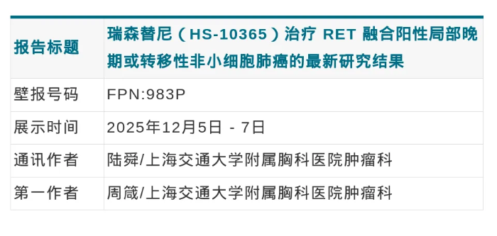 近日,翰森制药集团有限公司(以下简称“翰森制药”,03692.HK)自主研发的高选择性转染重排(RET)抑制剂瑞森替尼(受体酪氨酸激酶HS-10365胶囊),用于RET基因融合阳性的局部晚期或转移性非小细胞肺癌(NSCLC)治疗的研究结果于2025年欧洲肿瘤内科学会亚洲年会(ESMO ASIA)上以壁报形式发布。